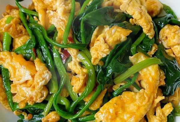 2.在平底锅中加热油。当油热时,加入蛋液并煮至凝固。然后炒香,再加入菠菜,加入豆沙调味,炒香后起锅即可。