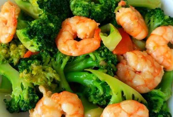5.在平底锅中加热油。油热后,加入切好的大蒜,翻炒片刻,直到出香味。然后加入大虾翻炒至变色。然后加入西兰花,炒至光滑。