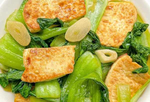 3、锅底加油,放入蒜片爆香,再放入菜籽稍微炒软,放入豆腐。加入蚝油和生抽调味,继续翻炒均匀,起锅即可食用。