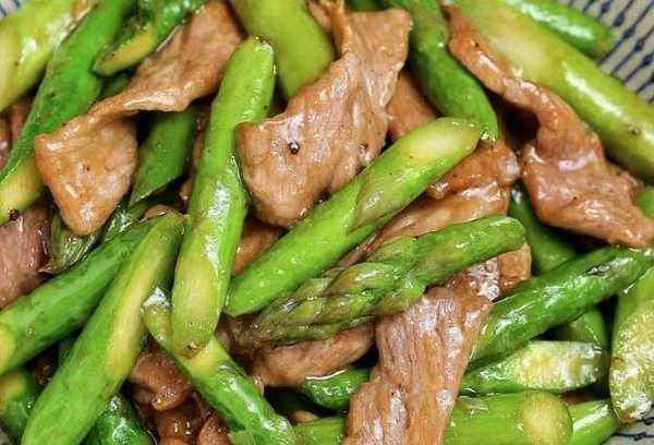 5.再次加热油。当油热时,加入蒜末炒香。然后加入芦笋、盐和蚝油,翻炒几下,然后加入牛肉炒至顺滑。在上面撒上一些黑胡椒,然后在上菜前翻炒几下。