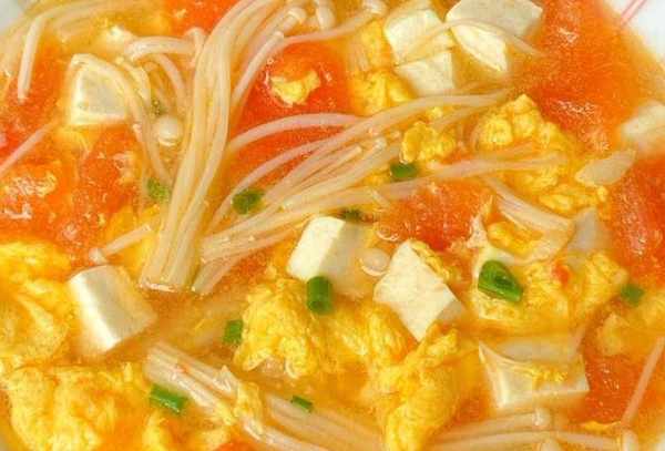1.金针菇切块,洗净沥干水分。将西红柿去皮,切成小块。软豆腐切成小块。将鸡蛋打入碗中,用筷子搅匀待用。