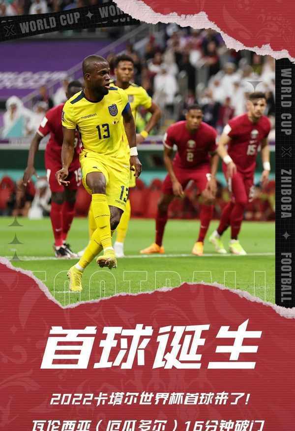 比赛继续,上半场第15分钟厄瓜多尔抢断后发起反击。又是瓦伦西亚接队友传球单刀直入,卡塔尔门将直接出击扑倒瓦伦西亚,主裁果断判罚点球,门将吃到本届世界杯第一个黄牌。瓦伦西亚主罚点球,干净利落推射破门,厄瓜多尔1-0卡塔尔,本届世界杯第一粒进球产生。