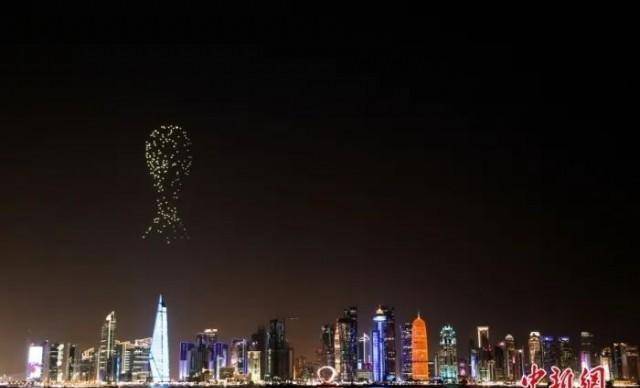 多哈天际线上方出现了一场带有欢迎词的无人机表演。