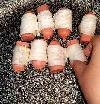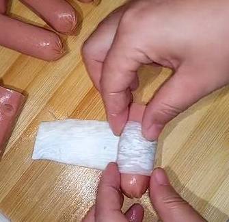 然后我们开始处理火腿肠。把火腿肠从中间一切两段,如果是比较长的火腿肠的话,可以切成三段。长度的标准就以杏鲍菇的宽度为依据,火腿肠比杏鲍菇要长出一厘米,那具体为什么要这样做下一步就能看出来。因为这一步我们需要用杏鲍菇卷起火腿肠。是不是很特别呢?就跟玩儿似的,这个过程中也可以让孩子参与,这样他吃起来更有趣。