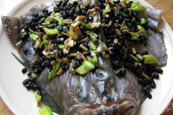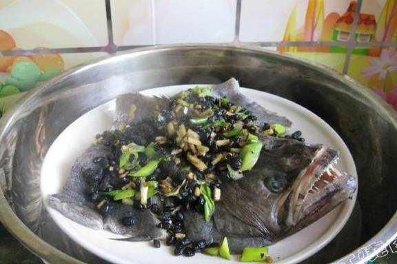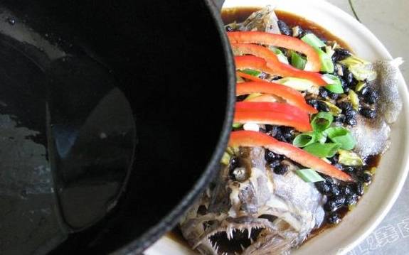 5.上面摆上料酒腌过的鲽鱼头然后再铺一层煸好的豆豉葱姜末