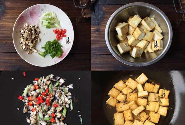 材料:豆腐2块、洋葱2个、香菇1个、大蒜2个、小米椒2个、味精1茶匙、生抽2茶匙、黑胡椒少许