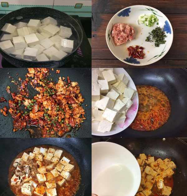 原料:豆腐2块,肉末适量,小葱2根。干辣椒5条、青椒1撮、豆瓣酱2勺、味精1茶匙、生抽1茶匙、水淀粉3勺、花椒粉少许