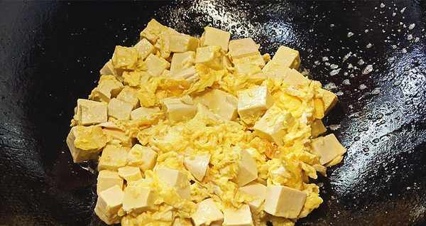 【第六步】:锅里放一勺油,加热到60%的热度,也就是又开始冒烟了,把豆腐和鸡蛋液一起倒进去煮熟,备用。