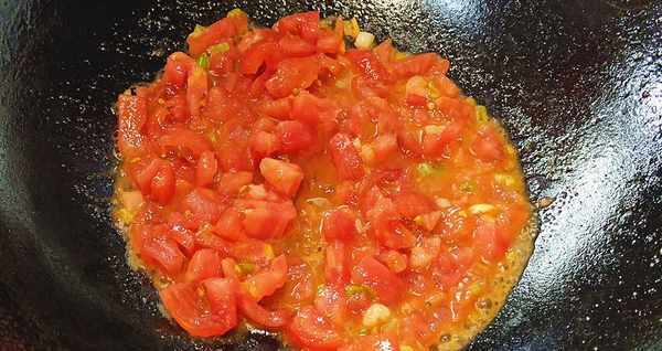 【第七步】:再起锅,油少许烧热,转小火,加入切好的葱花炒香,倒入西红柿煮出汁。