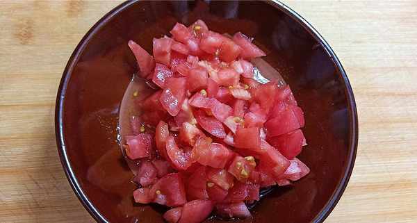 【步骤一】:将西红柿洗净后将十字刀放入碗中,再倒入开水烫一下,去皮再去根,然后切成方块待用。