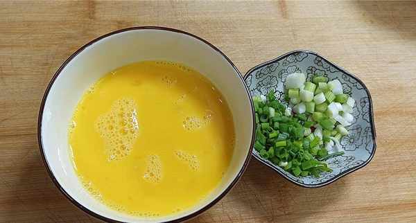 【步骤3】:鸡蛋打入碗中,加入少许白醋,搅拌均匀,葱末切段装盘。这里需要注意的是,洋葱的叶子和叶子要分开切。