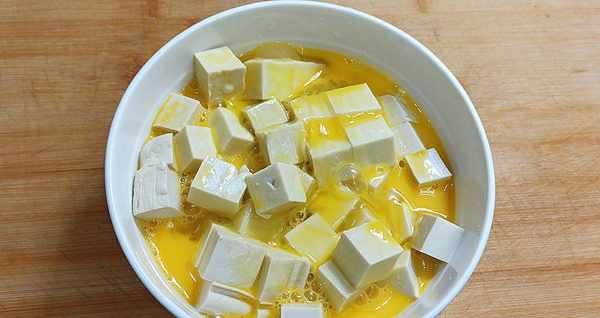 【第五步】将泡好的豆腐洗两遍,捞出沥干水放入碗中,同时将蛋液倒入豆腐中。