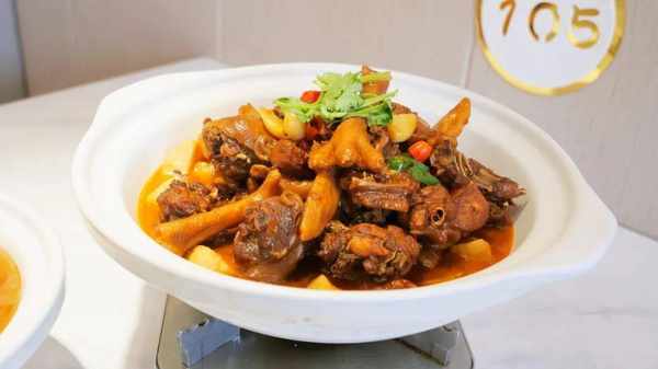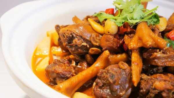 经验丰富的大厨火候拿捏得精准,秘制酱料大火爆香小火慢炖锁鲜,浓稠的酱汁均匀地附着在了鸡肉上,每一块鸡肉都染上了诱人的酱色!