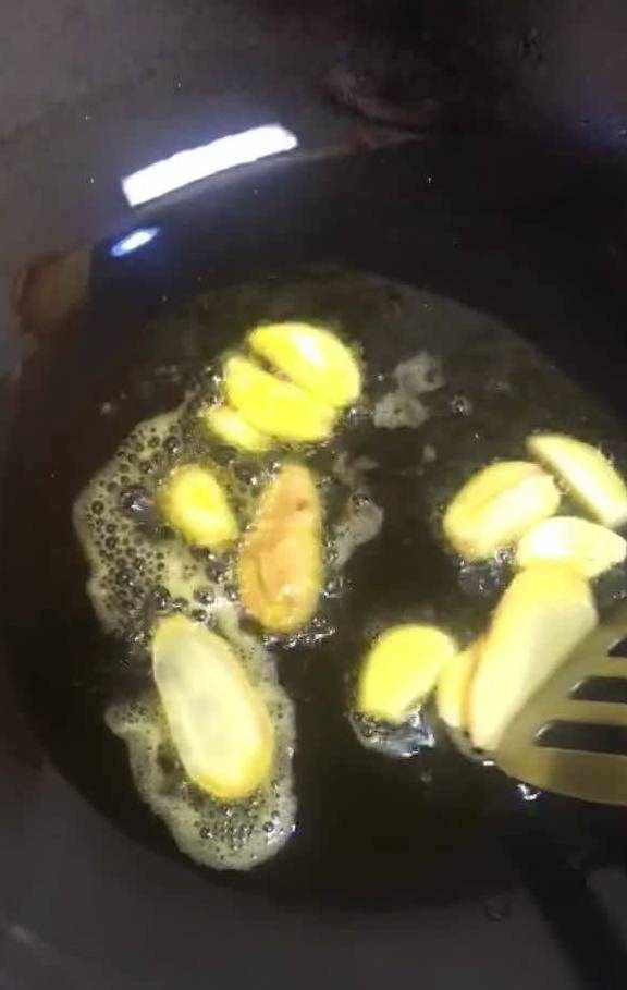 植物油(花生油)两勺,放入蒜片、生姜爆香,这两样食材即可去腥又能祛寒,南方人传统的做法都是如此。