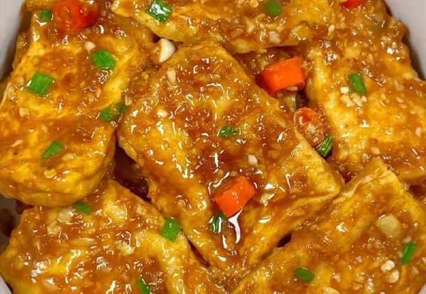 3、再次起锅烧油,油热后放入蒜末爆香,再放入煎过的老豆腐和酱汁,焖煮一会儿。