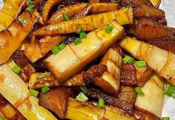 3、锅中底油放入春笋翻炒,炒香后放入煸过的五花肉,加入生抽、老抽、白糖和胡椒粉调味,翻炒均匀入味,淋入一点清水焖煮五分钟。