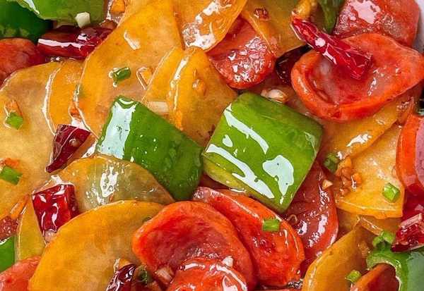 1、土豆用削皮刀削掉外皮,清洗干净后切成片。青椒去蒂后洗干净,然后切成小块。腊肠斜切成片即可。
