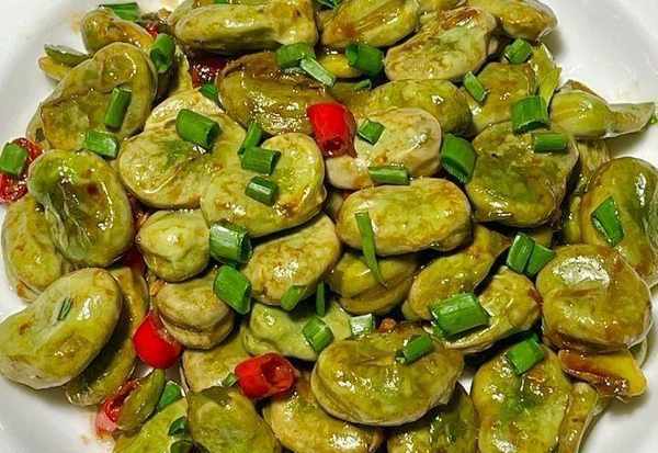 2、起锅烧油,油热后放入葱花和小米辣翻炒出香味,再放入蚕豆翻炒一会儿,加入生抽、蚝油、食盐和白糖调味,翻炒均匀入味。