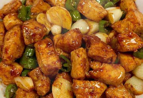 3、再次起锅烧油,油热后放入蒜子和青椒翻炒,炒香后放入煎过的鸡胸肉翻炒均匀。