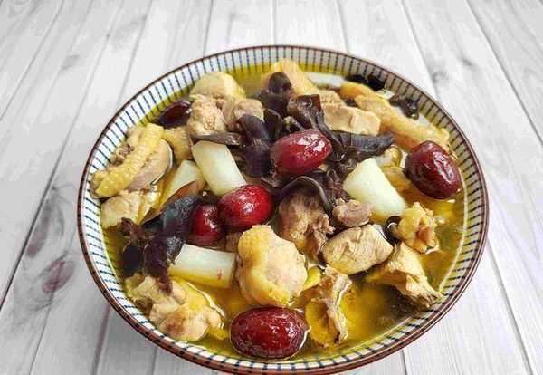 做法:土鸡处理干净,剁成小块,冷水下锅,加入料酒和姜片,焯水10分钟,用漏勺捞起,冲洗一遍,放入砂锅中,加入几片生姜,倒入足够的清水,中火炖60分钟。再放入木耳、山药、红枣,继续炖20分钟,最后加入盐调味即可。