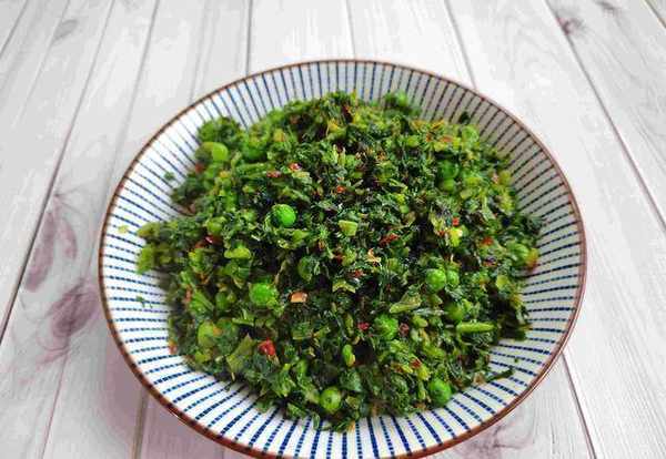 食材:甜豌豆、雪里红、花生油、盐、生抽、干辣椒面