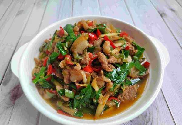 做法:土猪肉洗净切片,放入肥肉煸炒出油后,放入瘦肉炒香,盛出备用。锅里留油,放入大蒜梗和辣椒爆炒出香味,再放入土猪肉混合,加入盐、生抽、蚝油、料酒炒匀,最后放入大蒜叶子翻炒几下即可。
