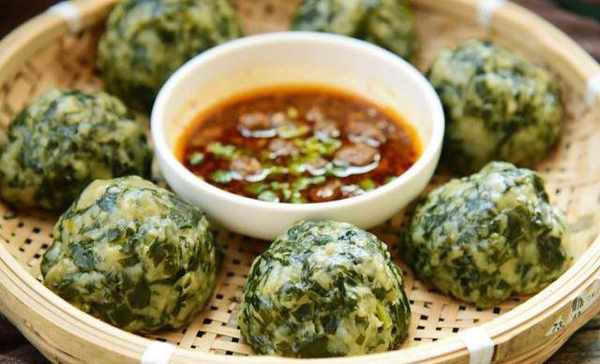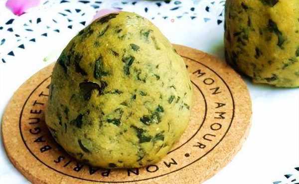 2.然后再把清洗好的红薯叶直接放在玉米面里面,用手揉成光滑的面团。分成大小均匀的剂子,然后用手团成圆球。每个圆球从中间转几圈做成窝窝头的形状。