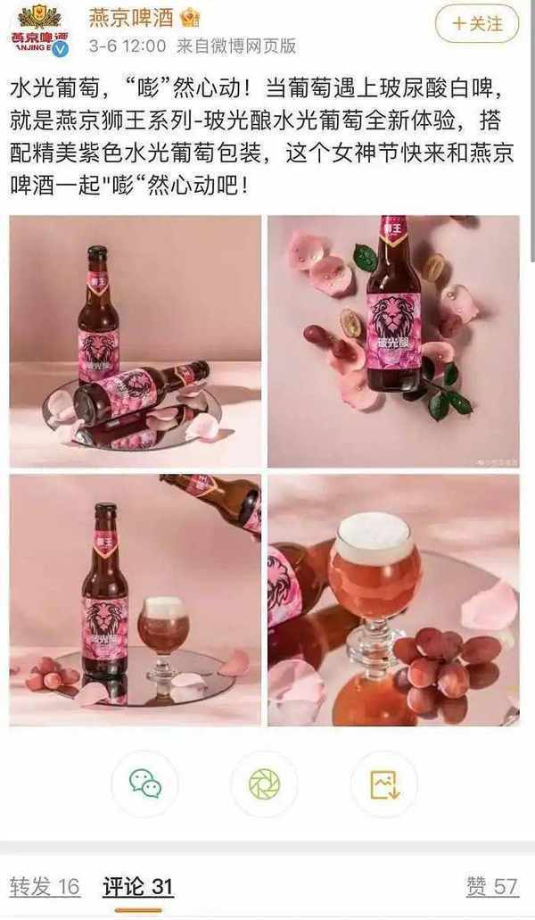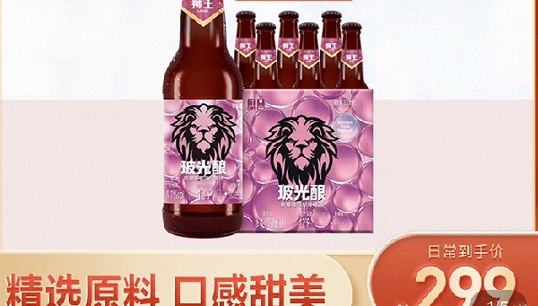 目前该产品在淘宝售价为299元/6瓶,单瓶价格达50元。根据淘宝产品页的图片展示,这款啤酒与花瓣、水果、粉红色背景共同呈现,与女性场景进行关联。根据介绍,狮王玻光酿玫瑰葡萄精酿啤酒在制作时加入红葡萄汁与透明质酸纳,强调这是一款“可以喝的玻尿酸”。