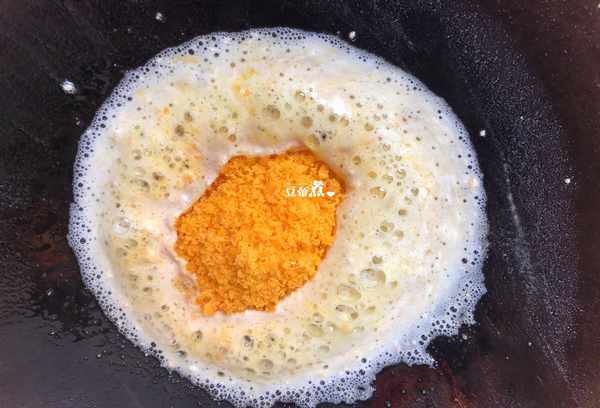 7.倒掉大部分的油,只留下一点油基。然后加入之前准备好的碎蛋黄快速炒香。