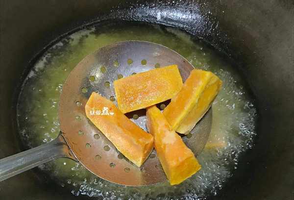 8.倒入预先炸好的南瓜片,搅拌至光滑即可从锅中取出。