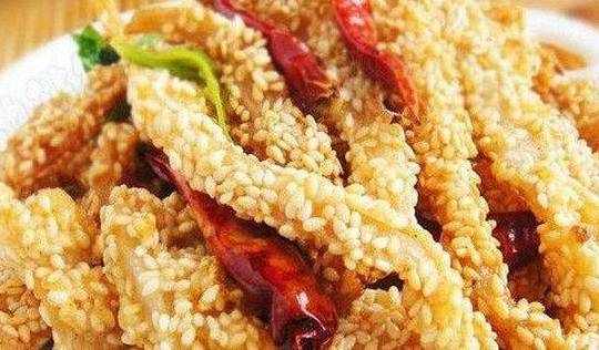 芝麻藕丝是以鸡蛋、藕、白芝麻为主要原材料制作而成的菜品,配料是淀粉水、白醋、干红椒丝等,通过翻炒的方式做成,可以当做小吃或者下饭菜都是非常好的。