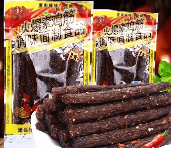 第3种也是一种特别有名的辣条名字,叫做火爆鸡筋,虽然说它是有一个鸡的名字在里边,但是它是用面粉做出来的纯素食,估计有很多辣条当中都不由自主的带上了一些肉类的名字,可能因为他是素食,想要附和一些荤菜。变得能够更加吸引人,不过这个火爆鸡筋,即使没有真正的鸡肉在里边,它的味道吃起来也特别香,而且跟大刀肉不同的啦,其实火爆鸡筋吃起来香油味特别重,而且还带着一点麻辣味,特别受人欢迎,尽管吃着让人辣的吐舌头,可是一吃就停不下来。