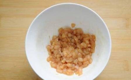 3、鸡胸肉切丁后用少许的盐和料酒腌制上10分