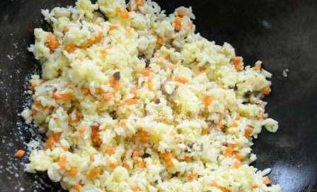 6、下入香菇丁和胡萝卜丁,炒到香菇味出来,胡萝卜断生。倒入拌好鸡蛋的米饭大火开炒。