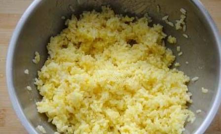 5、米饭中打入鸡蛋,抓成粒粒散开的状态方便后边的炒制。
