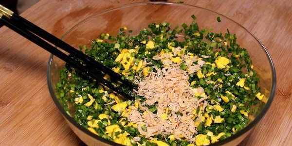 然后锅留底油,把鸡蛋五个下锅,炒熟炒散后倒在案子上剁碎晾凉,和韭菜放在一块然后再抓上一大把的虾皮,放点盐鸡精味精调味,再放点花椒油香油拌匀,馅料就做好了,