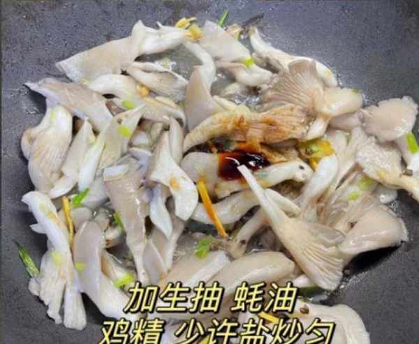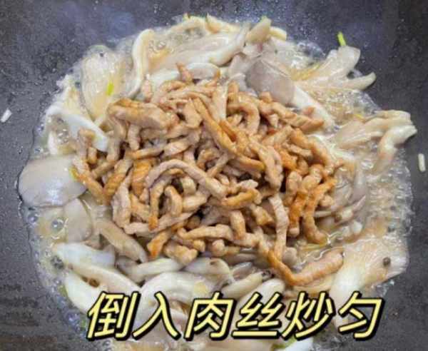 7:倒入一些平菇丝,将其炒出水分,加上一勺生抽和蚝油,加上一丢丢食盐,半勺白糖和半勺鸡精。