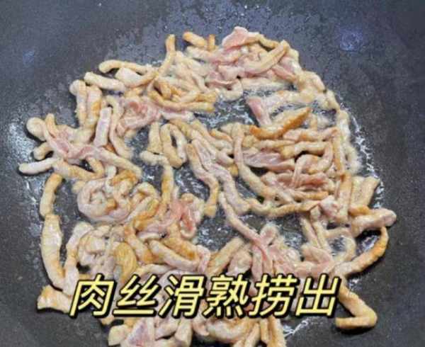 5:锅底烧热加上冷油,油温烧热一会儿,倒入一些瘦肉丝滑散,将瘦肉炒至变色,加上半勺生抽和蚝油,迅速翻炒均匀,将瘦肉丝上色,装在容器备用。
