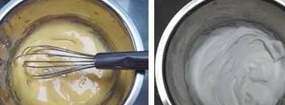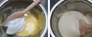 2、然后先取三分之一蛋白和蛋黄糊混合均匀,再将其他的蛋白混合好;