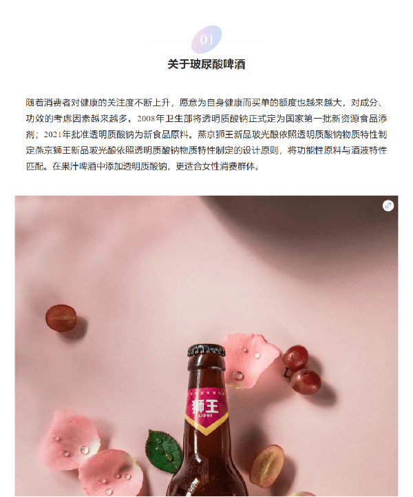 从电商平台展示的产品宣传图片可以看出,这款啤酒与浅粉色背景共同呈现,还有粉红色花瓣为衬,偏向于女性消费场景。而在产品的相关推文中也有表述:“将功能性原料与酒液特性匹配。在果汁啤酒中添加透明质酸钠,更适合女性消费群体。”