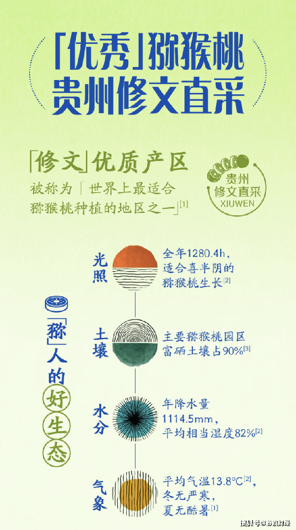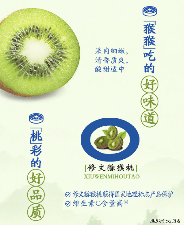 贵州修文猕猴桃生长在平均海拔1200米的高山上,独特的气候环境成就了所产猕猴桃“7分甜、3分酸”的钻石酸甜比口感。不仅如此,修文猕猴桃维生素C含量是等量柑橘的五至六倍,同时还富含氨基酸和多种矿物元素、蛋白质水解酶。