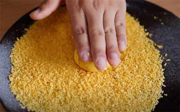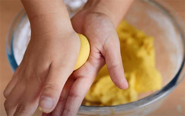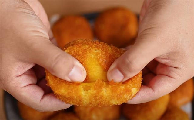 7.南瓜和糯米粉这样搭配起来特别好吃,甜甜糯糯的,这种糕点不建议用烤箱或者是空气炸锅,出来的口感会偏干硬扎实一点。