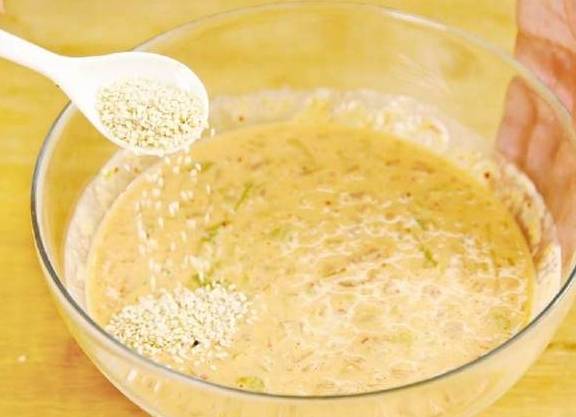 2.加入白糖和鸡蛋拌匀,再加入面粉和水调成稠糊,最后加入芝麻调匀。