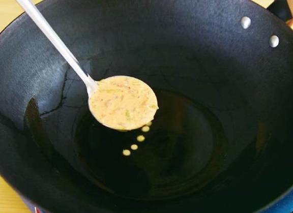 3.平底锅上火烧热,薄涂一层色拉油,舀入一大勺面糊摊成薄饼。