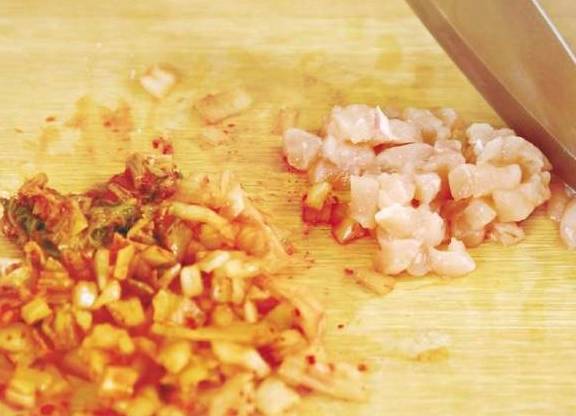 1.泡菜和腌鸡胸肉分别切成小丁。