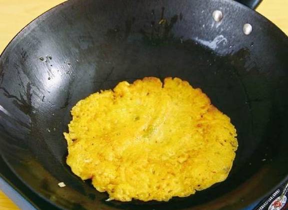 4.以小火煎至一面呈金黄色后翻面,续煎另一面至金黄熟透,出锅即成。