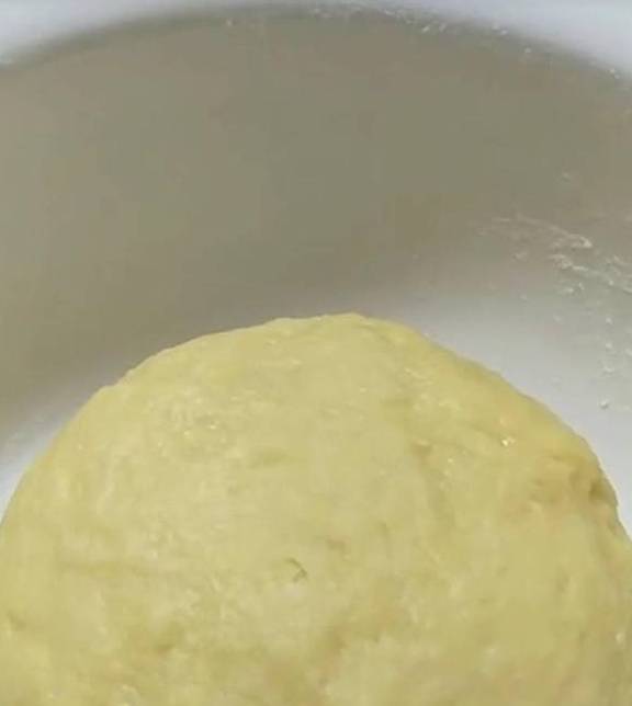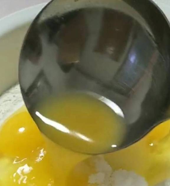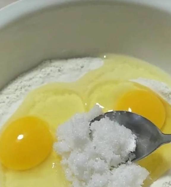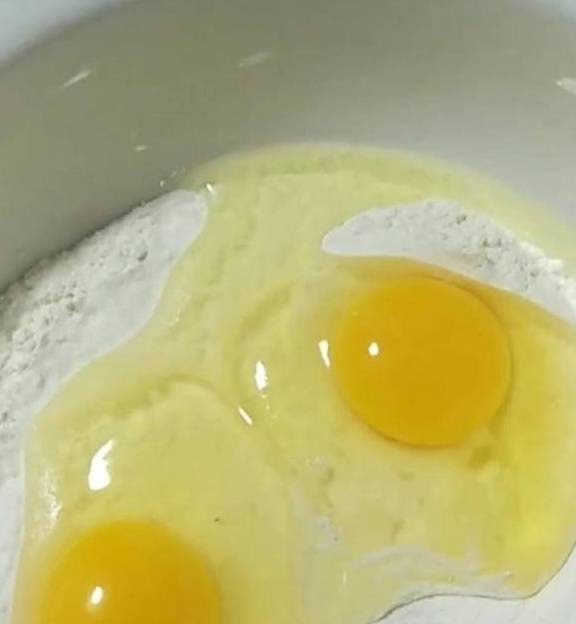 第一步:面粉(350克)+两个鸡蛋+2小汤勺勺白糖,