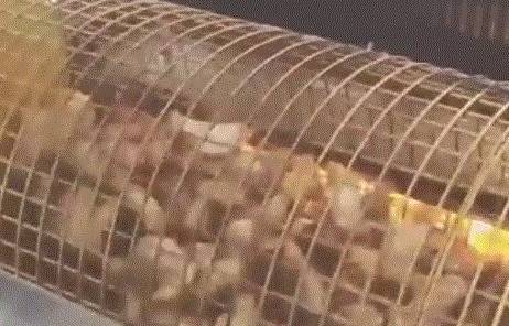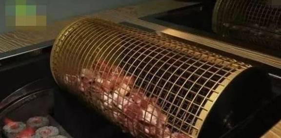 其实呢,这是最近在棒子国很火的一种烤肉方式,叫做“滚筒烤肉”,就和滚筒洗衣机的原理是一样的~把切好的肉肉倒到滚筒里面,然后把滚筒移到煤炭的上方~