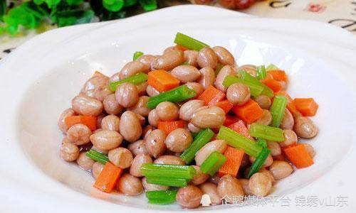 ⑤最后将芹菜、胡萝卜、花生米放在一起,加入盐、生抽、鸡精、香油拌均匀,这道菜就做好了。