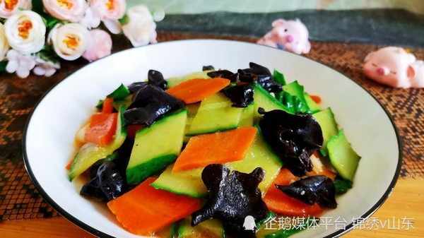 ⑴木耳用温水充分泡发后洗净,黄瓜洗干净后切成菱形段,再改刀切为细丝。